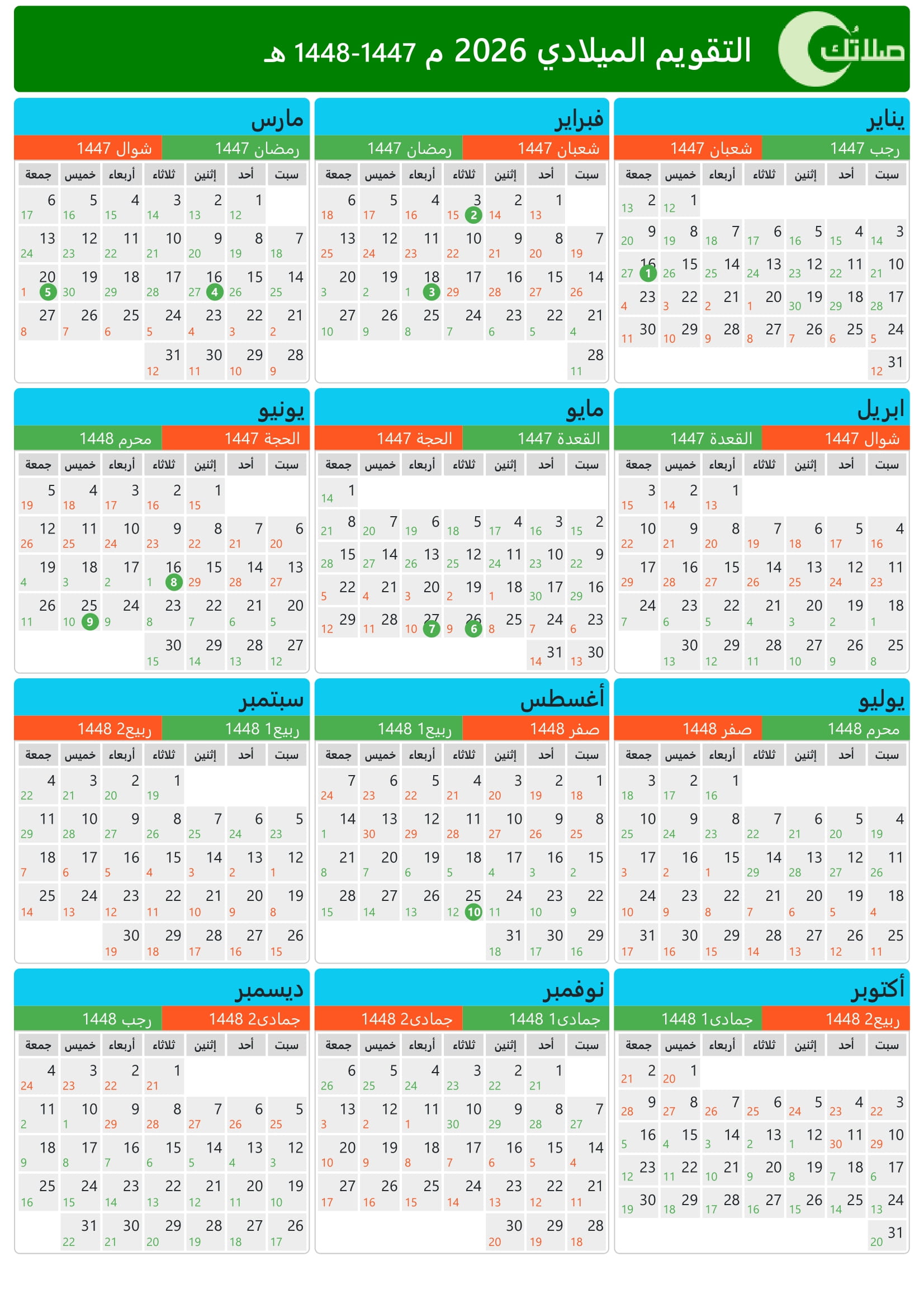التقويم الميلادي الهجري 2026 (1447-1448) المملكة العربية السعودية